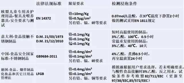 从上表可知,不同国家对于食品接触制品的金属迁移标准有所区别,检测方法也有区别,很难从数据上直接比较。但是从已有的经验来看,对金属迁移要求从严格到宽松依次为: