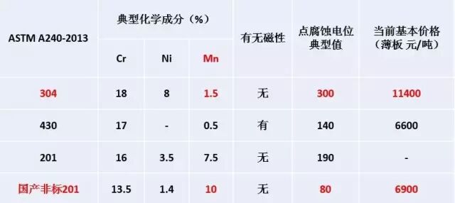 需要指出的是,在美国不锈钢钢板与钢带标准ASTM 240中的200系通常由较高的Cr含量与镍含量,但是国产非标200系则Cr、Ni含量较低。典型的成分、性能及价格如下表。