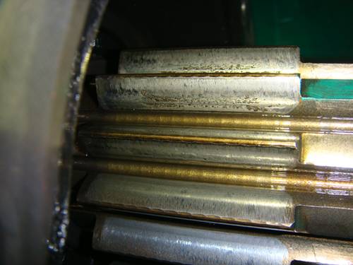 滚剃工艺加工的齿轮由于热处理变形,热后齿部不加工,齿部没有得到热后矫正,齿部质量存在齿形齿向的差异,齿轮啮合时会以点接触或线接触,造成齿面点蚀导致齿轮早期接触疲劳失效。如图1为齿轮齿面齿形齿向符合性好的一对齿轮副正常啮合疲劳失效的零件照片,图2为齿面齿形齿向符合性差的一对齿轮副疲劳失效的零件照片。